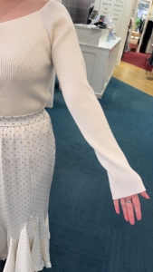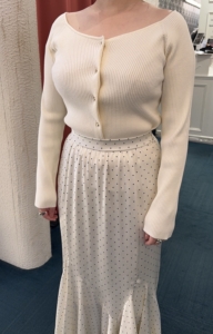 広めに開けた衿ぐりがデコルテをキレイに見せてくれ、