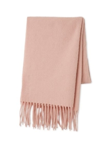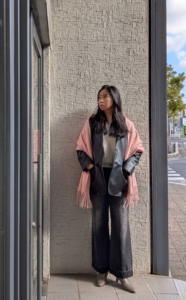 モノトーンコーデに桜色のストールをポイントにすると