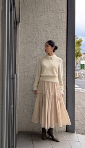 トレンドの衿付きニットと、華やかなティアードスカートがセット。