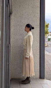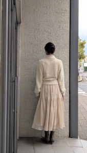襟つきニットと、モードなスカートの2枚セットで、ホリデーシーズンにオススメ!!