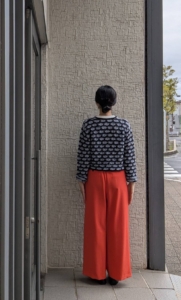 ステッチワークと脇ハギに共地のパイピングを効かせたり